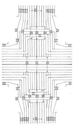 開放型人行道115進(jìn)入路口前讓位于電動(dòng)車道。縱向電動(dòng)車道301人行道302位于兩端路面橋上的橫向掉頭車道與縱向高架車道的中間,兩端分別穿越右轉(zhuǎn)彎車道(高度以電動(dòng)車行人順利通過為宜)。人行道出入口107、108跨越電動(dòng)車道,人行道出入口107-108之間(橫向)為地下通道穿越各縱向車道(高度以電動(dòng)車行人順利通過為宜)。電動(dòng)車道出入口109-110之間(橫向)為地下通道,穿越人行道入口107、108和各縱向車道(高度以電動(dòng)車行人順利通過為宜)。