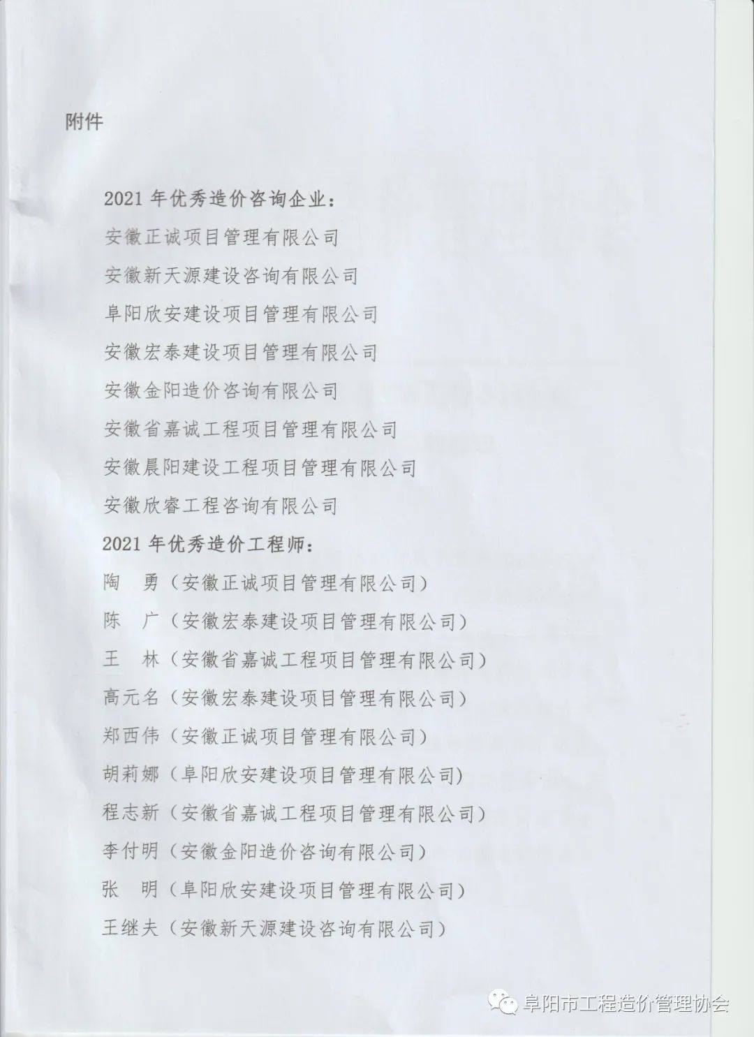 關(guān)于2021年度阜陽市“優(yōu)秀工程造價咨詢企業(yè)及優(yōu)秀造價師”評選結(jié)果的通知