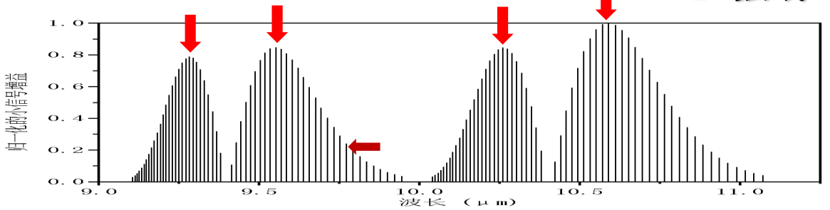 通常CO2激光器波長是10.59mm,這只是CO2激光增益譜中最強的一條譜線。從圖2-3 CO2激光器的譜線圖中可以看出,實際上有四條譜線的增益都比較大,分別為10.59mm、10.25mm、9.55mm及9.27mm。以上四條譜線為各支的強線。但是在很多應(yīng)用需求中,除輸出這四條強線外還要求輸出某些增益很低的弱線,且實際應(yīng)用中還需要很高的光束質(zhì)量,因此有較大的研制難度。