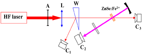 但是Fe2+:ZnSe激光器的實現(xiàn)也存在一個難點,即在室溫下難以實現(xiàn)激光輸出,這是由其自身的能級特點所決定的。目前電子所采用自行研制的脈沖HF激光器泵浦Fe2+:ZnSe晶體,取得了比較好的效果,在室溫下實現(xiàn)了脈沖能量高達80 mJ的激光輸出。實驗光路如圖2-11所示。實驗未采用垂直入射泵浦方式,而采用小角度斜入射的泵浦方案,解決了雙色鏡鍍膜難的問題。