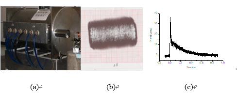 我們研制的高重復(fù)頻率TEA CO2激光器,如圖3-3(a)所示,輸出波長10.6 μm,單脈沖能量可達15 J,重復(fù)頻率可達150 Hz,平均功率達到2250 W。圖3-3中(b)、(c)分別為該激光器的光斑形狀及脈沖波形。該激光器光斑形狀方正,能量分布均勻,并具有較高的峰值功率。