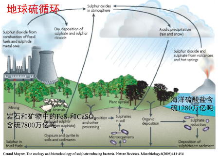硫磺是重要化工原料,我國是硫磺消耗大國也是進口大國,2017年我國硫磺進口達1123.6萬噸,產量590萬噸。硫循環(huán)是地球三大物質循環(huán)之一,硫各種價態(tài)間轉化的實現均由硫細菌來完成(圖1-1)。