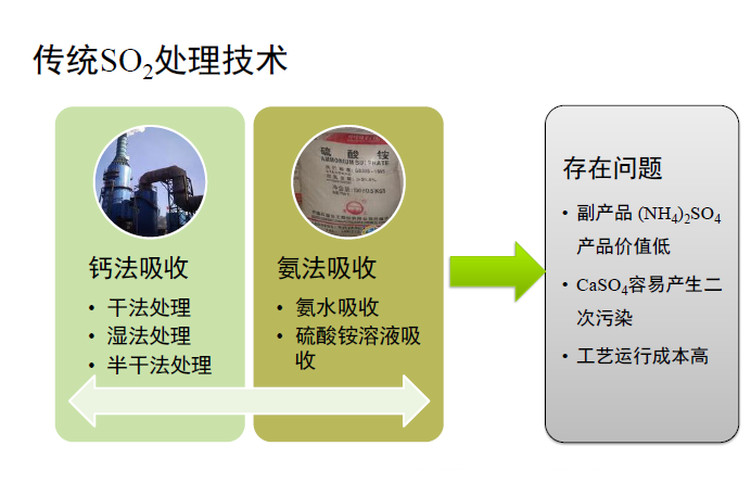 傳統(tǒng)的二氧化硫處理技術主要有鈣法吸收、氨法吸收,二者均存在運行成本高,易產生二次污染的問題。