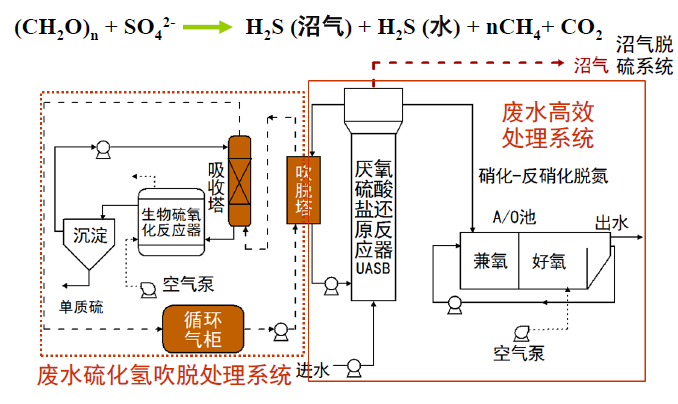 在高硫酸鹽廢水處理集成系統(tǒng)中,首先硫化氫先經過吹脫處理,降低硫化氫對后續(xù)反應中對厭氧反應的抑制。經吹脫過的廢水進入厭氧硫酸鹽還原反應器,進行一系列后續(xù)高效的硝化與反硝化處理,最終出水達標排放(圖1-9)。