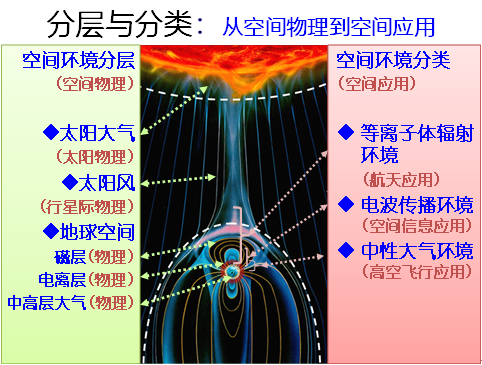 首先介紹日地空間的一些常識。在太陽表面的部分稱作太陽大氣,就是太陽物理。在太陽和地球之間,存在太陽風(fēng),又稱作行星際物理。在距地球附近,稱作地球空間。地球空間又有磁層,在距地球1000公里以上,處于等離子體輻射環(huán)境,與航天應(yīng)用有關(guān)。在距地球60-1000公里之間,存在電離層,與空間信息應(yīng)用有關(guān),屬于電波傳播環(huán)境,在飛行物飛行期間,需要通訊、導(dǎo)航、定位等。在距地球30-100公里間,屬中高層大氣,又叫中性大氣環(huán)境,高空飛行物如導(dǎo)彈在這一層飛行。