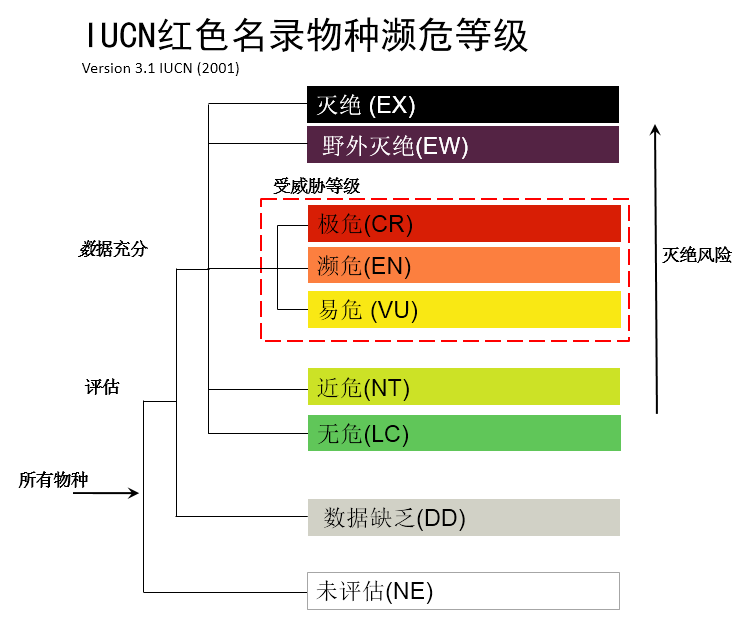 IUCN自20世紀(jì)60年代成立之日起,就設(shè)立了物種生存委員會(huì)(SSC),開始編制和印刷《IUCN瀕危物種紅皮書》,后來隨著評估物種的增加,印刷版逐步發(fā)展為網(wǎng)絡(luò)版的《IUCN瀕危物種紅色名錄》,定期編制發(fā)布。IUCN/SSC研究制定了《IUCN物種紅色名錄瀕危等級和標(biāo)準(zhǔn)》,根據(jù)物種的種群數(shù)量和分布情況等,評估其生存狀況,確定其瀕危等級。IUCN瀕危物種等級標(biāo)準(zhǔn)分為“有評估數(shù)據(jù)”和“數(shù)據(jù)缺乏”兩類,“有數(shù)據(jù)評估”中又分為“滅絕”、“野外滅絕”、“區(qū)域滅絕”、“極?!薄ⅰ盀l危”、“易?!薄ⅰ敖!焙汀盁o?!钡?個(gè)級別,從“無?!钡健皹O?!保瑴缃^風(fēng)險(xiǎn)逐步上升,瀕危等級逐步增加。瀕危等級標(biāo)準(zhǔn)有5個(gè)指標(biāo),分別是種群下降、有限地理分布區(qū)、下降小種群、非常小或非常有限的種群、以及模型模擬等量化分析,根據(jù)這些指標(biāo)的數(shù)量閾值,來評估物種的瀕危等級。