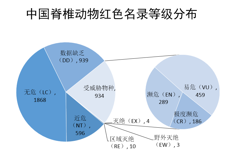 2015年完成的《中國生物多樣性紅色名錄-脊椎動(dòng)物卷》,共評估了中國4357種脊椎動(dòng)物,包括673種哺乳類,1372種鳥類,461種爬行類,408種兩棲類,1443種淡水魚類。其中939種數(shù)據(jù)缺乏,1868種無危,596種近危,受威脅的物種共934種。在934種受威脅物種當(dāng)中,易危459種,瀕危289種,極度瀕危186種。受威脅的原因分析中,過度利用、生境喪失和人類干擾是最主要的威脅因子。