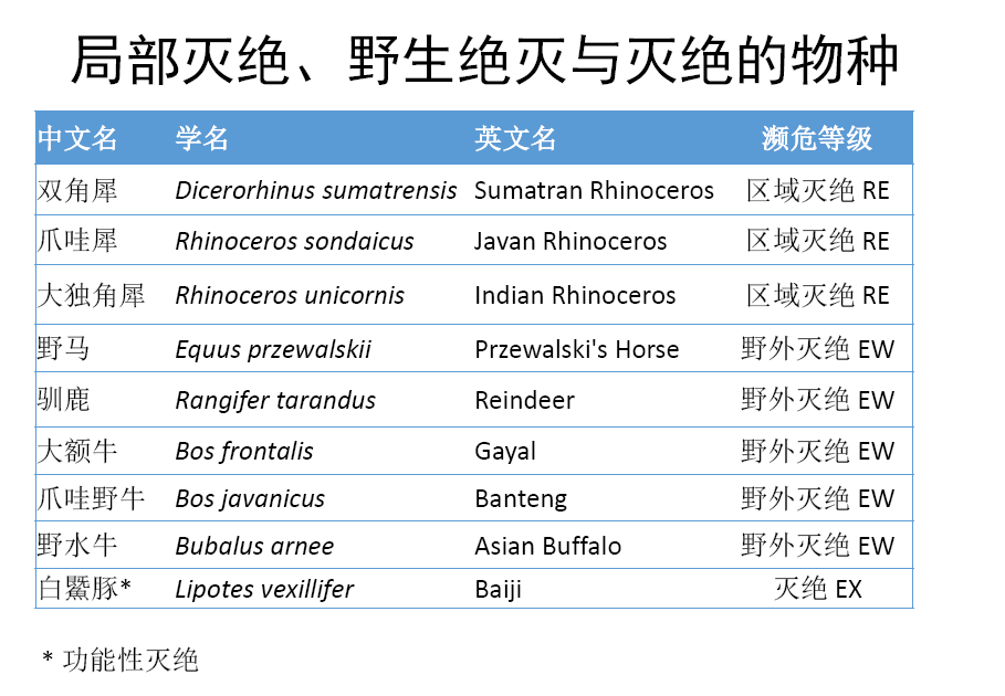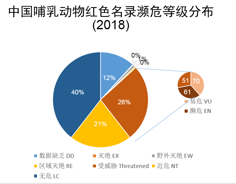 此外,我們對中國哺乳動(dòng)物多樣性進(jìn)行編目,分別于2015年和2017年完成了第一版和第二版,第一版中,我們收錄了673種哺乳動(dòng)物,第二版中我們刪除了一些不存在的物種如倭巖羊,并增添了一些物種,主要是分布在藏南的一些物種,共收錄了693種哺乳動(dòng)物,使得我國的哺乳動(dòng)物總數(shù)位列全球首位。2015年發(fā)布《中國生物多樣性紅色名錄-脊椎動(dòng)物卷》后,2018年又對該紅色名錄等級進(jìn)行了更新,哺乳動(dòng)物的情況來看,最新的評估結(jié)果中,受威脅的物種占26%、近危21%,無危40%,數(shù)據(jù)缺乏12%,其中有多個(gè)物種已經(jīng)區(qū)域滅絕、野外滅絕或功能性滅絕。部分中國特有的哺乳動(dòng)物,中國生物多樣性紅色名錄和IUCN紅色名錄的評估結(jié)果,由于評估信息的不同,結(jié)果也有所不同,如白鱀豚、長江江豚等;還有一些哺乳動(dòng)物由于并非中國特有,所以中國生物多樣性紅色名錄和IUCN紅色名錄評估等級有所不同,如野馬、賽加羚羊、麋鹿、蒙原羚、河貍等。