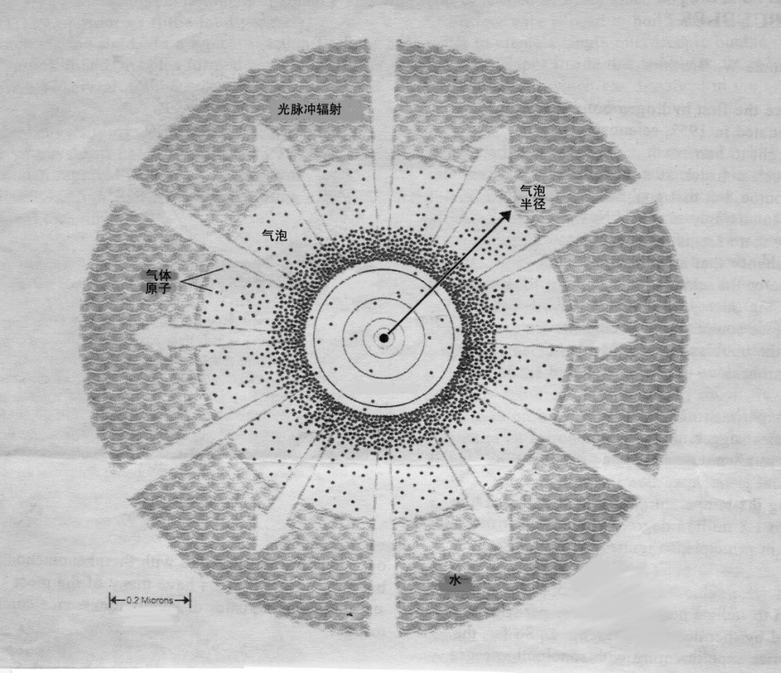 氣泡聲致發(fā)光如圖所示。氣泡外面是水。這個氣泡在超聲波的作用下,一會變大一會變小,氣泡里的小黑點代表氣體里的分子和原子。圖中標尺的長度是0.2微米。氣泡在塌縮到一定程度時就發(fā)出光。