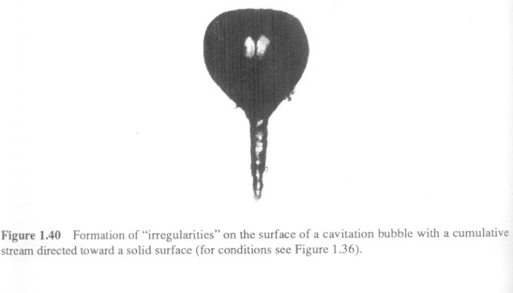 當氣泡靠近容器壁時,氣泡的形狀會持續(xù)變化,變到后來長出一個尾巴,像錐子一樣,錐子尖指向容器壁。這是氣泡典型的形狀,如圖3所示。通常人們會認為氣泡是一個球,但現(xiàn)在看來并非如此。首先,這個錐形是非常尖的;第二,它是非常有力的,呈向外噴射狀。它碰到固體的邊時,會打擊出一個小窟窿、一個麻點,所以超聲波作用時間長了以后,固體的邊和拋光的面就會變毛。正因為這個力量是非常大的,作為超聲清洗的機理之一,即超聲波可以清洗骯臟的油、污漬等等。它的條件是一定要靠近固體邊,就是氣泡和固體邊相互作用。所以通過這兩張圖,我們能看出來,空化氣泡里面研究的學(xué)問是很深的。