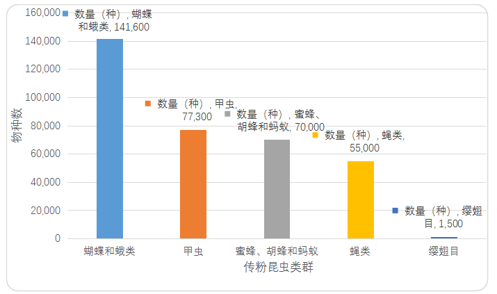 傳粉昆蟲占所有動物傳粉的80%~85%,為植物-傳粉者生態(tài)系統(tǒng)提供重要服務(wù),其重要性得到科研工作者和大眾的廣泛認(rèn)同。據(jù)估計,全球生物物種多樣性約870萬,昆蟲占一半以上,是自然界最主要的傳粉者。目前,已報道的傳粉昆蟲約35萬種,涉及鱗翅目(約14萬種)、鞘翅目(約7.7萬種)、膜翅目(約7萬種)、雙翅目(約5.5萬種)以及其他類群(約0.8萬種)。蜜蜂是最主要的傳粉昆蟲,約有17,000種,全球107種重要作物種類中的90%是由蜜蜂完成傳粉。