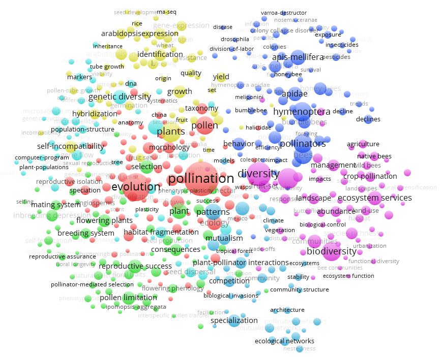 與此同時我們還通過ESI對pollination和pollinator等關(guān)鍵詞進(jìn)行檢索,可以大致得出傳粉昆蟲研究領(lǐng)域的現(xiàn)有研究前沿如下:1)常用新煙堿類殺蟲劑對蜜蜂的殺傷作用;2)野生授粉昆蟲對農(nóng)業(yè)增收和作物健康的積極影響;3)傳粉昆蟲種群測量與評估;4)花朵與傳粉昆蟲的生態(tài)聯(lián)系。通過利用Vos Viewer軟件繪制傳粉生物學(xué)關(guān)鍵詞共現(xiàn)(co-occurrence)聚類圖,獲得傳粉生物學(xué)領(lǐng)域的研究熱點包括:1)傳粉昆蟲的形態(tài)學(xué)、系統(tǒng)進(jìn)化、分類學(xué)方面的研究;2)傳粉昆蟲介導(dǎo)的植物繁殖、選育、選種等的研究,以及花粉限制對傳粉昆蟲的影響;3)殺蟲劑導(dǎo)致傳粉昆蟲,尤其是蜜蜂、熊蜂的種群下降的影響;4)傳粉昆蟲介導(dǎo)的植物基因表達(dá)、生長、增產(chǎn)等;5)景觀變化、城市化等環(huán)境因素導(dǎo)致生物多樣性降低、傳粉服務(wù)功能下降、傳粉昆蟲群體數(shù)量下降等影響評估,并提出相關(guān)的控制與管理措施;6)植物-傳粉昆蟲互作與共生、植物與傳粉昆蟲形成的生態(tài)網(wǎng)絡(luò)結(jié)構(gòu)等方面的研究;7)傳粉使植物基因流擴(kuò)散,使植物基因變異和多樣性。