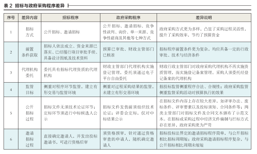 招標(biāo)方式選擇、前置條件獲取、代理機構(gòu)委托、活動過程的監(jiān)管等均對程序履行產(chǎn)生影響。針對這些方面招投標(biāo)與政府采購活動存在差異,詳見表2。表2中有關(guān)差異內(nèi)容正是兩法體系及監(jiān)管制度差異的客觀反映。弄清兩類活動程序差異,有利于管理人員找準(zhǔn)工作要點,規(guī)范操作行為。