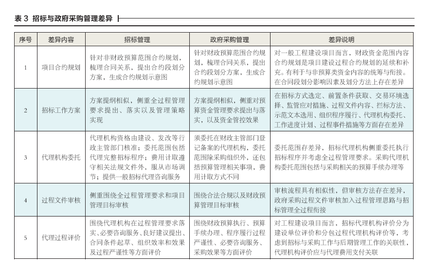工程建設(shè)項目招標(biāo)管理是指站在建設(shè)全過程視角對招標(biāo)活動實施的一系列管理工作。同理,政府采購管理指采購人針對擬組織實施的采購活動開展的一系列管理工作。政府采購管理過程除遵循財政預(yù)算控制要求外,依然需將全過程思想貫穿始終。上述兩類活動管理目標(biāo)均包括降低過程風(fēng)險、提升交易效率、確保交易質(zhì)量、滿足全過程管理要求等。招投標(biāo)或政府采購管理工作內(nèi)容均包括:合約規(guī)劃、工作方案編制、代理機構(gòu)委托、過程文件審核、招標(biāo)與采購代理過程評價等方面。針對上述內(nèi)容,兩類活動有關(guān)差異內(nèi)容詳見表3。